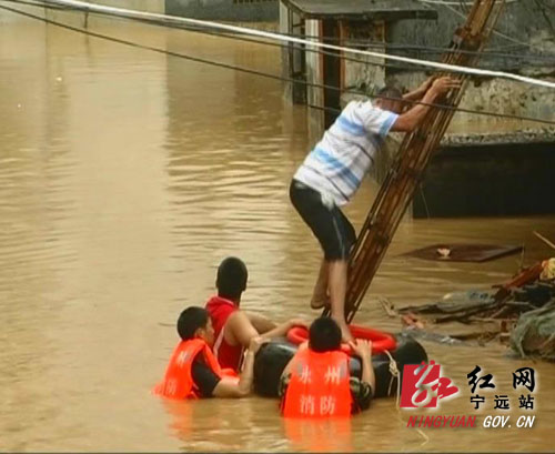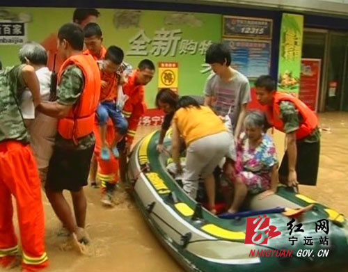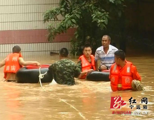 据了解,从16号晚上20:00至17号早上宁远县城降雨量为142.5毫米,县城已成一片汪洋,河水里随处可见从居民家中漂浮出的小家具和日常生活用品。女英路段由于地势低洼,大部分房屋一楼被淹,现场,不断传出被困群众的呼救声。由于涨水时间是深夜,水涨得太快,等到居民发现时家里的洪水已经齐腰深了。为了第一时间将群众转移到安全地带,尽量减少损失,县消防官兵们带着安全绳、救生衣、救生圈从16日晚上至17日白天一直没有停歇挨家挨户对受困群众进行搜救。由于道路狭窄,洪水势猛,救援官兵在一米多深的洪水中艰难前行,但是大家仍然没有放慢救援的脚步,大家一边救人一边对被困群众喊话,让他们尽量待在高处,等待救援。