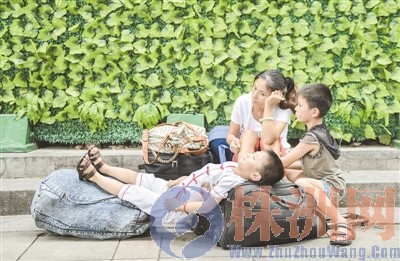 昨日,株洲长途汽车站外,由广州前往娄底的刘女士带着两个孩子等待着亲人买汽车票。汪成/摄