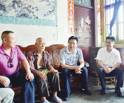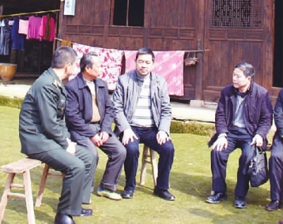 县长吴飙(左三)与乡村干部座谈人口计生工作。