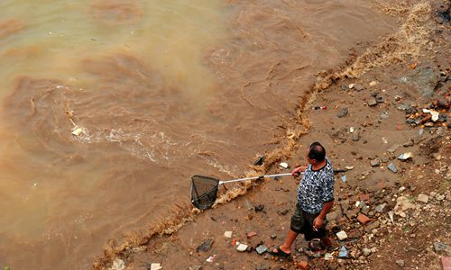 8月21日上午,长沙市杜甫江阁湘江岸边,市民用网在江中捞死鱼。当天,湘江长沙段出现大量不明原因的死鱼,沿岸不少居民赶来捞死鱼。据环保部门介绍,目前原因还不确定,建议市民不要食用这种从湘江捞到的鱼。本报记者 郭立亮 摄