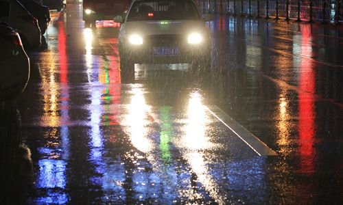 8月22日晚,郴州市区,车辆在大雨中行驶。当天,台风“潭美”从沿海登陆后影响我省南部,郴州地区普降大雨。本报记者 刘尚文 摄