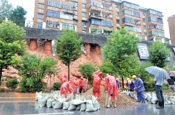 本报讯(记者 李春璞 通讯员 贺茂峰) 8月23日,在郴州市区青年大道,市政工人正在填装砂石袋,准备对道路边坡的一处滑坡进行抢险。当日,郴州市区青年大道路旁的一处护坡发生滑坡,一间抽水房被泥石流局部掩埋,导致边坡上的居民楼地基安全受到威胁,道路交通出行一度受阻,但未造成人员伤亡。目前,险情正在控制中,下雨仍在继续。