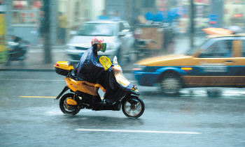 市民骑车在暴雨中行进,雨衣完全挡不住瓢泼大雨。李锋 摄