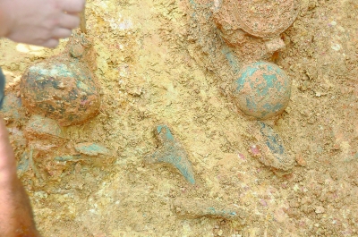 此轮发掘是去年考古的延续,从8月21日开始已发掘战国墓6座,仅出土陶器18件,直到M47号战国墓发掘,才有青铜器出土。29日上午10时50许,1件彩陶壶率先现身,历经2000多年刚出土依旧颜色鲜艳,但一见阳光颜色慢慢暗淡,随后彩陶豆、鼎、敦等相继出土。11时许,1把青铜矛柄在墓右下侧现身,随后青铜剑、矛尖、戈在墓右上方出土。因年代久远,铜器腐蚀严重,剑断成了几截。在清理出土器物时,在矛柄上方约20厘米处,惊现一铜锥(为矛或戈的配件),上面鱼龙纹栩栩如生。