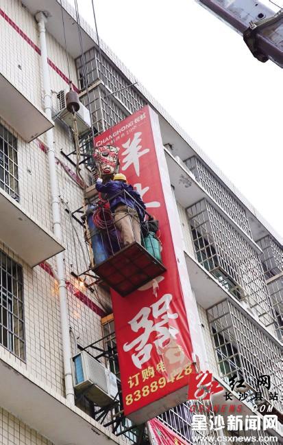 记者见到,两名工人进入一个铁制的吊篮里,随着吊篮缓缓上升,向楼体靠近,工人开始对广告牌支架进行气焊。几分钟后,一块标着“祥林电器”大字、长约5 米多的广告牌被拆除,其支架已经布满锈迹。一旁围观的居民67岁李娭毑说,“半个小时,这一线拆除了好几块广告牌,感觉清爽了很多,而且我们从下面走过,也不用担心安全问题。”