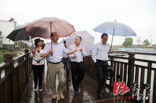 临湘市市委副书记、市长龚卫国(前排左一)龚卫国一行考察望城区乔口镇小城镇建设。(姚泽子 摄)