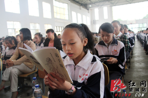 上午九点,书堂中学大礼堂传来阵阵读书声。来自书堂山中心小学、双合垸小学、书堂中学的部分学生手捧《弟子规》,大声诵读。随后,“孝亲感恩”夏令营的同学们还表演了手语舞蹈“跪羊图”等节目。通过习读国学经典诗文,观看爱心节目,学生们纷纷表示受益匪浅。