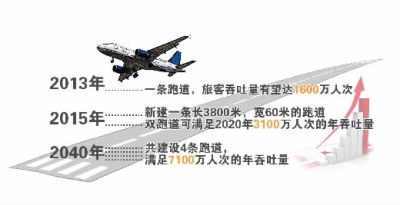 新跑道计划于2015年底建成投运。按设计,两条跑道可满足2020年3100万人次的旅客吞吐量、32万吨货物吞吐量、飞机起降量24.4万架次的需求。