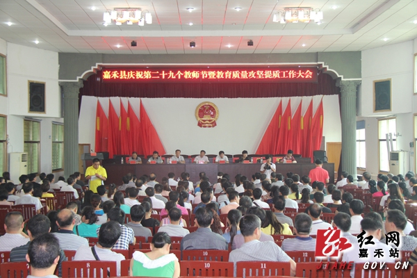 红网嘉禾站9月10日讯(分站记者 罗飞雄 通讯员 刘锋 李景庭) 9月10日,嘉禾县在县政府礼堂召开大会,隆重庆祝第29个教师节,并对新学年教育质量攻坚提质工作再动员、再部署。县领导孙佑民、张晓源、李佩军、朱宁静、文胜,县民办教育协会会长雷井杏、教育基金会理事长欧振昌以及全县各相关单位部门负责人、乡镇分管教育负责人、教育局股室以上负责人及中小学校校长、教师代表等300余人参会。