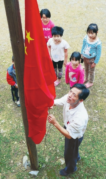 9月7日,曾令干老师和学生在合着节拍升国旗。虽然条件简陋,但升国旗仪式十分庄重。