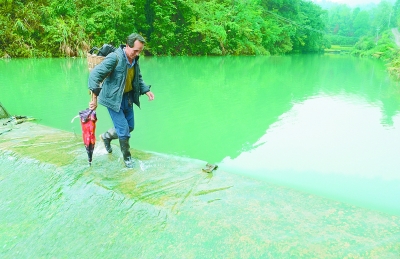 9月5日,龙承松走过一个水坝。由于学校没有住宿条件,他只能“走教”,每天从家里到学校需要走1个半小时的崎岖山路。