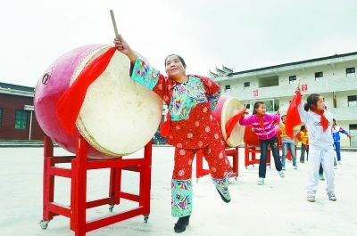 9月6日,麻素英在教孩子们打苗家迎宾鼓。