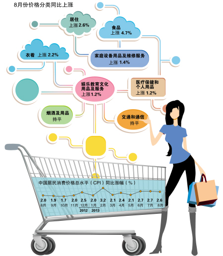 国家统计局9日发布报告,8月份全国居民消费价格总水平(CPI)同比上涨2.6%,涨幅比上月回落0.1个百分点。据国家统计局测算,在8月份2.6个百分点的CPI同比涨幅中,去年价格上涨的翘尾因素约为1.1个百分点,新涨价因素约为1.5个百分点。