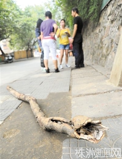 红网株洲站9月11日讯(株洲晚报记者 谢娇)走在人行道上,突然被一根“空降”的大枯枝砸伤后脑勺。前天晚上9点20分左右,家住石峰区株化生活区的程先生就遭遇了这样的倒霉事。