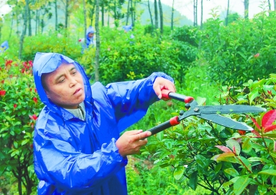 一场秋雨一场凉。下午3时,雨没有停止的迹象,苗圃的11名干部职工,穿着靴子和雨衣,在龙治国的带领下,来到花垣镇蚩尤村的苗圃里剪枝。