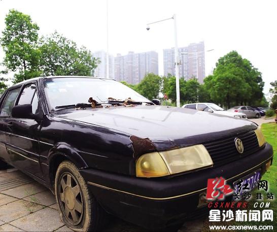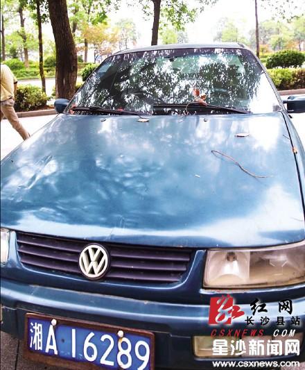 在星沙大道教师公寓楼下,停着一辆绿色大众帕萨特的“僵尸车”,车尾灯损坏,车上落着灰尘与落叶