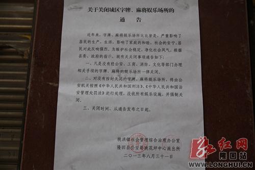 据悉,为维护社会稳定和谐,净化社会风气,根据县委、县政府指示,桃洪镇综治办和桃花坪中心派出所日前发布了《关于关闭城区字牌、麻将娱乐场所的通告》,要求凡是没有经公安、工商、消防、文化等部门办理相关手续的字牌、麻将娱乐场所一律关闭,并已告知各社区在9月5日之前自行进行关闭,否则将采取强制关闭措施。