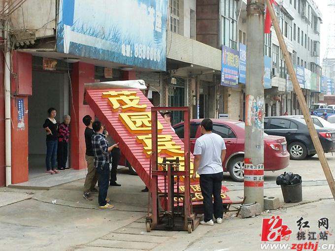 何革新是大栗港镇区“茂园宾馆”的老板,前不久,他花8000多元做了一块灯箱招牌安装在电线杆上。9月8日上午,何革新主动将这块广告招牌拆了下来,“虽然我的这块招牌刚刚才安装好,但我们还是无条件支持镇上的工作,因为这是为了大栗港的发展,为了建设绿色桃江。”