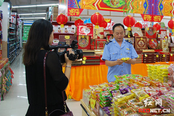 (执法人员在镜头前为消费者讲解如何选购月饼)