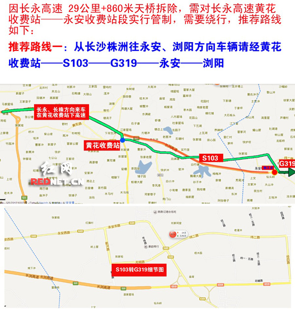红网长沙9月13日讯(通讯员 梁美芝)因永安枢纽旧桥改造,将定于9月15日21:00至9月16日6:00,在长永高速29公里+860米处对永安枢纽天桥进行拆除,期间将对该处高速路段进行临时管制,提醒驾驶人朋友提前规划好路线,具体分流措施如下: