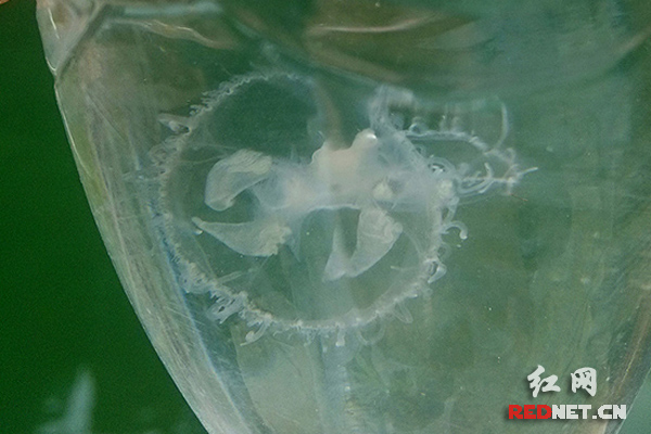 在千潭水库清澈的水体中记者看到,桃花水母的外形像一把撑开的伞,当一缕阳光洒向水面时,水母便浮到水面享受阳光;而一阵秋风掠过,桃花水母又慢条斯理地潜伏在碧绿水中。翩翩起舞的桃花水母,仿如飘落在水中的瓣瓣桃花,它无头无尾,晶莹透亮,柔软如绸,在水中一张一缩,上下飘荡,悠然自得,就像空中缓缓升降的降落伞。