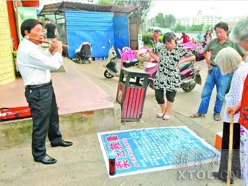 红网湘潭站9月16日讯(湘潭晚报记者 李政葳 实习生 戴浩)9月13日傍晚,经过雨湖区长城乡红旗市场门口的人,可能都会听到一阵阵悠扬的笛声。当晚,我们穿过围观的人群,发现在人群中吹笛子的是一名中年男子,在他身旁,铺着一张写有“卖艺救妻”字样的蓝色海报,在海报的左下角,放置着一个募捐箱。