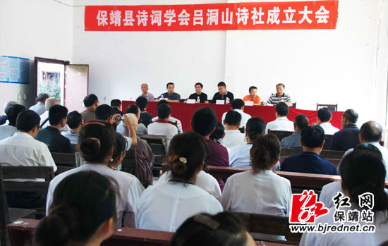 在镇政府会议室举行的成立仪式上,水田河镇党委副书记、镇长龙余金致欢迎词,龙余金与县诗词学会会长向东升一同为保靖诗词学会吕洞山诗社、吕洞山民族文化研究会成立授牌。会议还表决通过了诗社研究会组成人员,并且宣读了聘请诗社顾问名单。县文联、葫芦镇、夯沙乡等相关负责人分别作了讲话,县诗词学会、碗米坡镇分会、普戎镇分会等诗社纷纷为吕洞山诗社赠送贺诗。