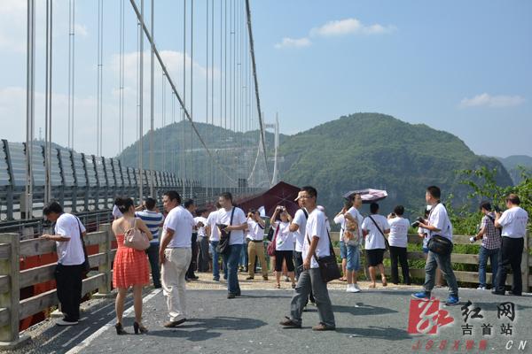 红网吉首站9月17日讯(分站记者 彭春林)“真是太美了!比我想象中的还要让人难忘。”9月14日上午,站在距地面300多米的吉首市矮寨大桥上,前来参加“谷韵吉首无微不至”中国(吉首)首届微信大赛“微友写微”活动的北京微友王杨如此感叹。随即,她把从矮寨大桥俯拍的照片发到了个人微信账号,在朋友圈惹来一片艳羡声。她说,看饱了钢筋水泥灌筑的高楼大厦后,充满民族风情、山林美景的吉首简直就像是从天上掉下来的。