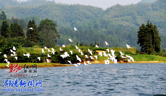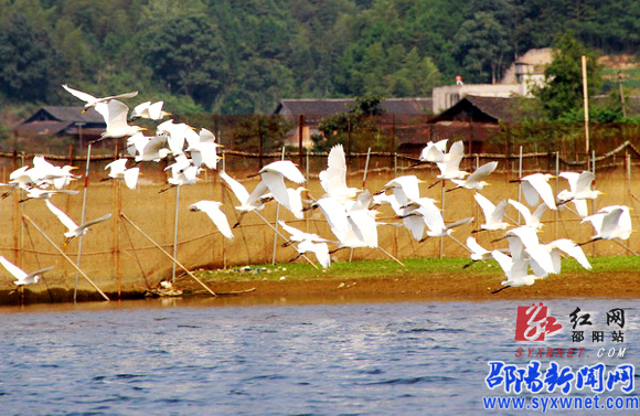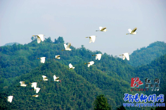 红网邵阳站9月18日讯(通讯员 向云峰)9月15日,绥宁县花园阁景区一群白鹭在水面掠飞。目前,花园阁国家湿地公园通过省级专家评审,并已上报国家林业局等待最终评审。花园阁国家湿地公园规划总面积780公顷,是许多候鸟迁徙的必经之地和水禽的重要栖息地,境内湿地类型多样,湖泊、山塘、浅水湿地、河滩地及河岸边森林构成较为完善的生态体系。在这里可以尽情欣赏鱼鹰常在水中立、白鹭成行天上飞的美景。