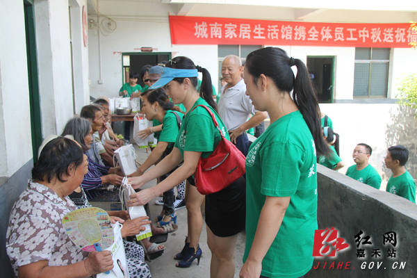 红网嘉禾站9月18日讯(分站记者 罗飞雄) “这些孩子们真不错,不仅给我们带来了月饼、水果,还给我们这些老人唱歌跳舞,谢谢你们了”,9月18日,中秋节来临前夕,嘉禾县城南家私生活馆的20余名员工先后深入到塘村镇敬老院和钟水乡敬老院开展中秋送温暖、送祝福活动,与全体老人欢聚一堂,受到了敬老院老人们的一致欢迎。