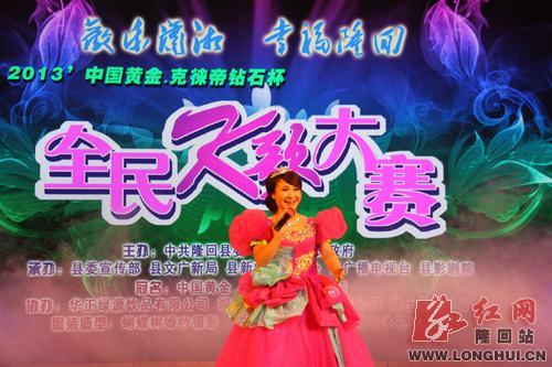 隆回县全民K歌大赛已举办5年,成为隆回唱歌爱好者展示才艺的重要平台。2013年的全民K歌大赛是由隆回县委、县政府主办,由县委宣传部、县文广新局、县新闻传媒中心、县广播电视台、县影剧院承办,是“欢乐潇湘 幸福隆回”八大系列活动之一,隆回电视台专门对这次决赛进行了现场直播。这次大赛报名参赛者达800余人,年龄最小的只有5岁,最大的超过了80岁。从8月17日第一场海选赛开始,通过多场海选赛和复赛、决赛,历时35天完美落幕。