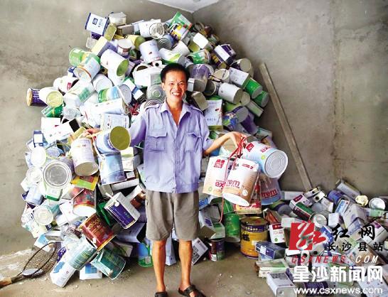 邓少华负责着小区的一部分保洁工作,从今年7 月份开始,就在小区内收集有害垃圾。“除了一千多个油漆桶,我还收集了一百多个废灯管和废电池。”邓爹爹说,一开始的时候家人还说他收集这些垃圾,又卖不了几个钱。经过一段时间的劝说后,家人也支持起邓爹爹收废油漆桶的“事业”。
