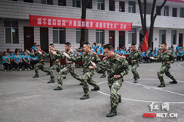 这次活动主要观看了武警中队的队列、武打、拆装枪支表演,在中队教练的教导下,干部职工开展了队列培训表演、叠被子等表演活动,参观了部队的住室、活动场所等,了解部队的日常生活情况。绥宁县民政局领导龙开科、徐翔,县财政局领导袁文彬、杨廷伟,武警中队领导荣洁在活动观摩主席台就坐,县民政局、县财政局100多名干部职工参加了这次活动。