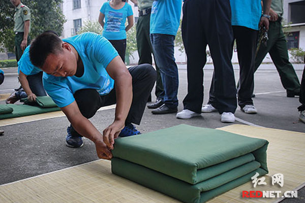 (参加活动代表在表演叠被子)