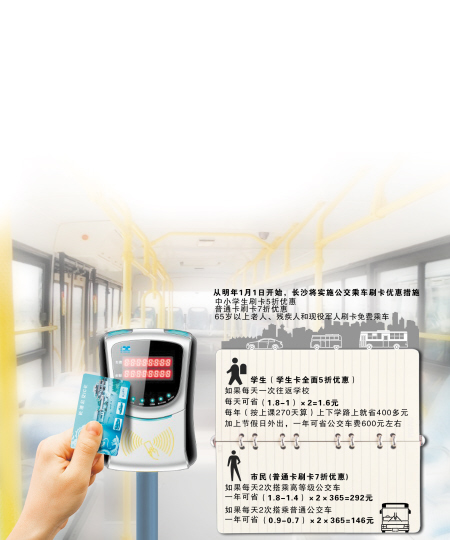 会议确定,从明年1月1日开始,长沙将实施公交乘车刷卡优惠措施,其中中小学生刷卡5折优惠,普通市民刷卡7折优惠,65岁以上老人、残疾人和现役军人刷卡免费乘车。