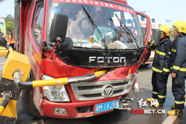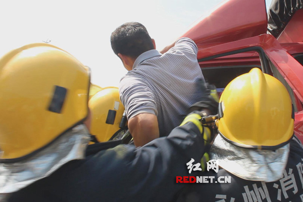 9月28日11:05,零陵大队接到报警后,立即组织官兵赶到现场。消防官兵到达事故现场后,只见事故现场一片狼藉,现场到处是散落的车辆零件、玻璃碎片,大卡车驾驶室严重变形,驾驶室内凌乱不堪,驾驶员被变形的车体牢牢卡住,无法动弹。经侦察,官兵们发现一根钢管从货车水箱处直插入驾驶室,在惯性的作用下又被折成90度后紧紧地卡在驾驶室,司机被变形的驾驶室牢牢卡住动弹不得。