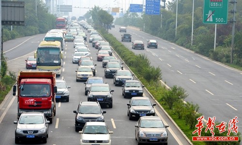 10月1日8时,长沙市岳麓大道西延长线通往长常高速方向车流量陡增,虽然通行缓慢,但秩序井然。“十一”黄金周期间,全国高速公路仍实施小客车免费通行政策,许多人选择了驾车出行度假。当天,长沙出城车辆明显增多。