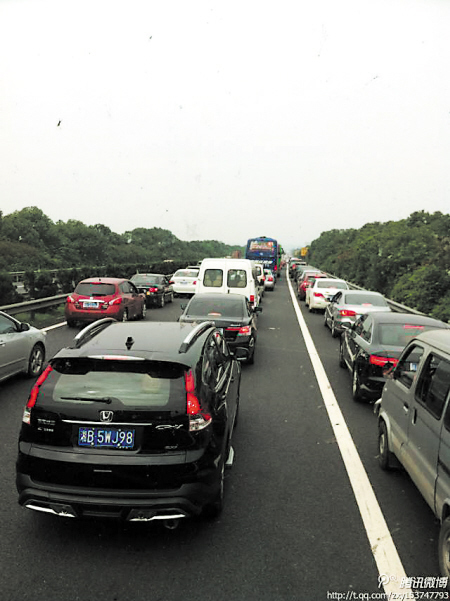 长常高速东往西32.5公里处,因为铁路桥修建施工,原本的3个车道变成2个车道,导致车辆拥堵。网友“十指紧扣”供图