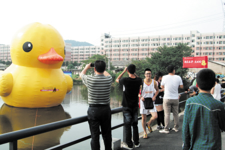 “哇!快给我来张合影。”见到可爱的“大黄鸭”,昨日下午,大学生梁文与伙伴们迫不及待地合影留念。记者现场了解到,国庆长假期间,长沙首次从香港引进的“大黄鸭”造访河西大学城阜埠河路一侧的后湖,吸引了大量市民前来参观,俨然成了抢镜明星,光10月1日单日就“接见”粉丝近3万人次。据介绍,由湖南锦绣潇湘文化产业园引进的“大黄鸭”由荷兰艺术家霍夫曼设计,高12米、长约15米,为橡皮材质。