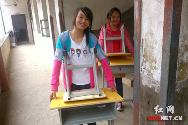 红网湘乡10月9日讯(通讯员 欧阳勇 谢敏学)10月8日上午,国庆假期过后开学的第一天,在湖南湘乡市金薮乡金薮中学读初三的李盈从学校领到了一套崭新的课桌椅,她高兴地对笔者说,这回写字再也不会歪歪扭扭了,新桌椅坐着很舒服。捐给李盈同学这套新课桌的爱心人士叫王宇红,他曾是金薮中学的校友,现在在长沙创办了一家公司。今年年初,他回到母校后,发现同学们的课桌出现了不同程度的破损,严重影响到了同学们的学习,毅然决定出资6万多元购买300张崭新的课桌,捐赠给同学们。
