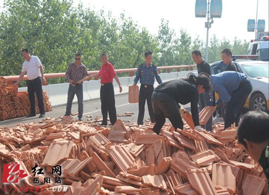 (路政员们一边协助交警维护秩序,一边帮车主将红瓦装上车)