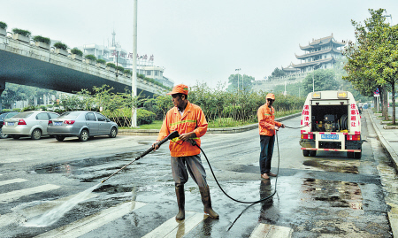 小型清扫车驾驶员肖国安和搭档每天在天心阁周边5条街道穿梭,他说每天都要在6时30分左右路上车辆不多时,抓紧时间冲洗路面污渍。李锋 摄