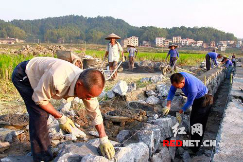 (10月11日,隆回县羊古坳乡雷峰村农业综合开发项目正在紧张施工。)