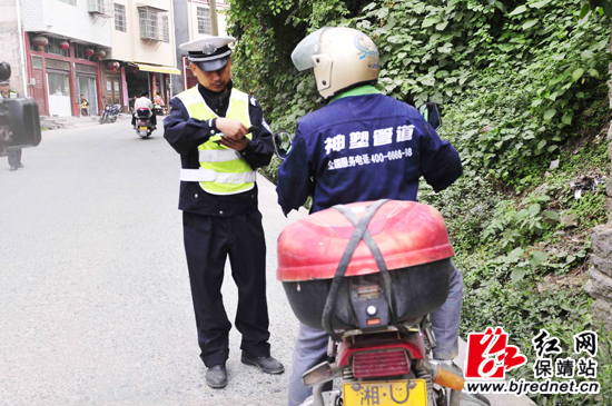 红网保靖站10月14日讯(分站实习记者 刘玲)“同志,请出示驾驶证、行驶证和强制保险证!”10月12日上午,在保靖县喜阳桥路段,一辆摩托车在该县交警大队民警的指挥下靠边停车,认真核对驾驶员提供的证件,并对驾驶人员未戴头盔的违规交通行为作了教育。