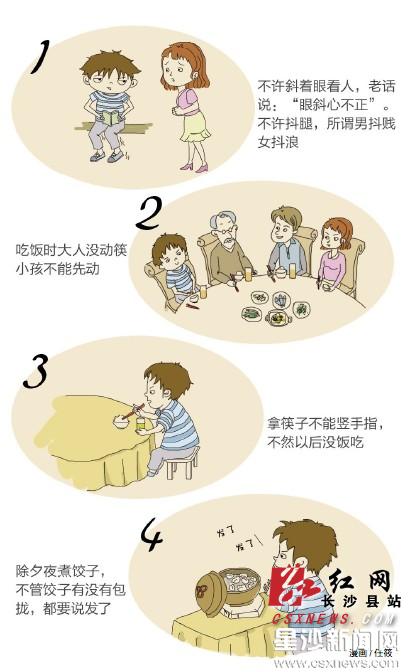 老家在邵东的晓舞,回忆起小时候的规矩,直呼“那吃饭做事一套一套的。”诸如“不准把筷子插在碗里”、“大人没动筷小孩不能先动”等规矩,到现在都必须遵守,没做好就会挨骂。她记得,小时候自己拿筷子喜欢把其中一根手指竖起来,被父亲说了几次仍改不掉,一次父亲怒了直接一巴掌拍在那根竖起来的手指上,狠狠教训,“拿筷子竖手指以后没饭吃。”有些规矩,在她看来“不可思议”,“除夕夜煮饺子当夜宵,大人会特意交代:‘不管饺子有没有包拢,都要说发了’,取意讨好彩头。当时我特较真,硬是说‘饺子都包得好好的,没有发’,结果父亲脸色铁青。”