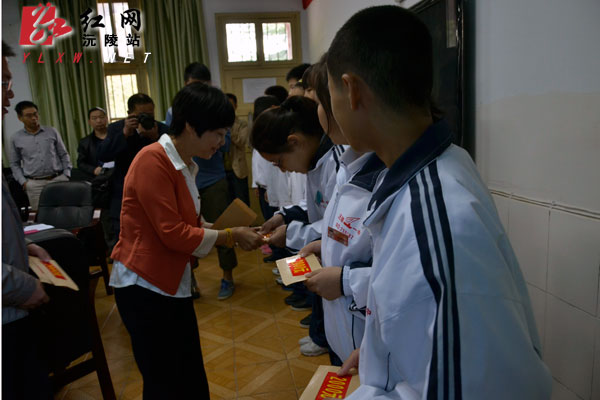 红网沅陵站10月16日讯(分站记者 瞿宏红 陶冶)“当得知成为受县民委资助的学生之一的时候,我感到十分地感动和喜悦,感动是来自于县民委对品学兼优但家庭贫困的莘莘学子的眷顾和厚爱,以及学校老师们的重视和关怀,喜悦则是因为自己可以为并不宽裕的家庭减轻一部分经济负担。这份感动与喜悦,更让我们坚定了在高中努力学习的决心和信心。” 10月16日上午,在沅陵一中举行的沅陵县首次少数民族义务教育助学金现场发放仪式上,来自该校高一贫困学子代天君坦露出自己的心声。她和沅陵一中另外9名同学每人获得2000元的捐助。