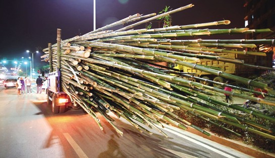 交警提醒,在运输竹子时,如果无法避免超出车身长度,驾驶员必须用垫木、铅丝或钢丝缆绳固定牢固,以防滑动;超出车身的尾部须白天插红旗,夜间悬挂红灯警示标志,以便于车辆安全行驶。