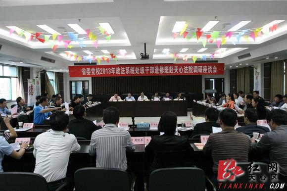 10月15日下午,省委党校2013年政法系统处级干部进修班47名学员在学校副巡视员陈明文的带领下,赴天心法院就“司法公信与司法公开”问题召开调研座谈会。天心区法院院长马贤兴以《加强法院公信建设 推动法院工作科学发展》为题,从司法公开、司法诚信、防治虚假诉讼专项活动等方面着重介绍了天心法院司法公信力建设情况。