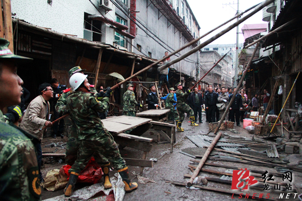 10月17日,龙山县消防大队官兵正在对北正街市场内的违规建筑依法实施拆除。