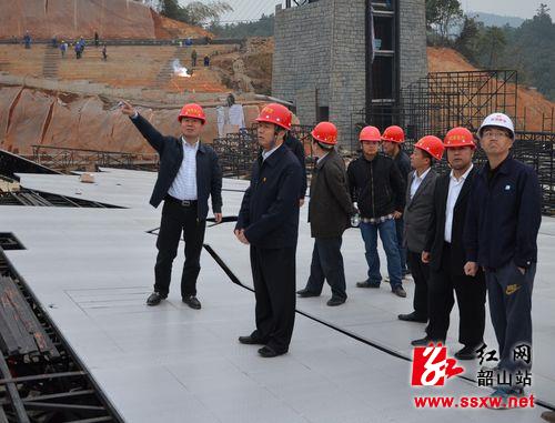 李江南一行首先实地视察了核心景区外环公路建设现场,随后又赶往润泽东方文化城建设现场。下午五点多,天色渐暗,但作为向毛泽东同志诞辰120周年献礼的重点项目,润泽东方文化产业基地大型实景演出《中国出了个毛泽东》项目现场还是一派热火朝天的建设场景。湘潭市人大韶山代表小组成员们走上主舞台,向相关负责人仔细了解项目的建设、进展情况。李江南指出,作为献礼工程和国内最大的实景演出基地,一定要保质量、赶进度,确保大型实景演出《中国出了个毛泽东》按质、按时上演,为主席诞辰奉上一道精彩绝伦的视觉盛宴。